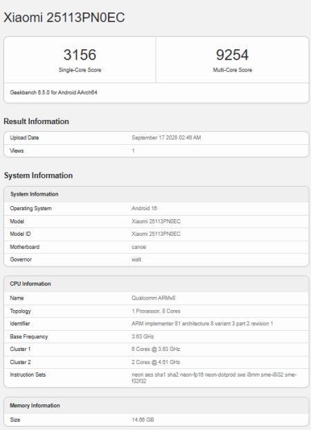 Также в базе Geekbench появились карточки Xiaomi 17 (25113PN0EC) и 17 Pro (25098PN5AC). Первый набрал 3156/9254 балла, второй — 3025/9178 баллов. На скриншотах видно, что оба тестовых смартфона получили Android 16, 14,66 ГБ ОЗУ (16 ГБ) и процессор с двумя кластерами: на шесть ядер (3,63 ГГц) и два ядра (4,61 ГГц).
